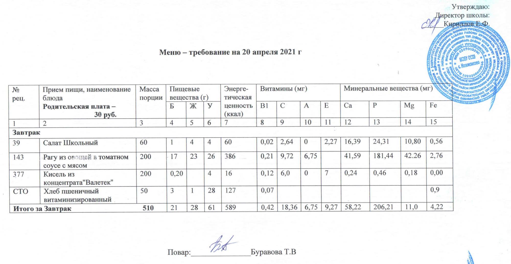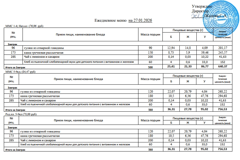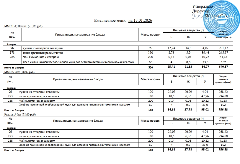 Стоимость школьного питания